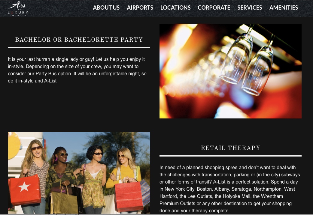 We love helping companies do a number of things to strengthen their marketing efforts. Often it’s done in a rebranding process, building a new website, or strengthening the message, or a in a variety of other ways. However, what we at OneEighty love the most is when we get to start from scratch: new business, new brand, new website and working with our clients to powerfully project a new image in the market. This is the case with our client, A-List Luxury Car Services. The look and feel of the logo and supportive design elements are consistently carried through in its new website and advertising campaign. The specialized black car service is already carving a unmistakable niche with transportation to and from airports throughout the Northeast, corporate travel (complete with an optional mobile office), a night out on the town and special excursions.